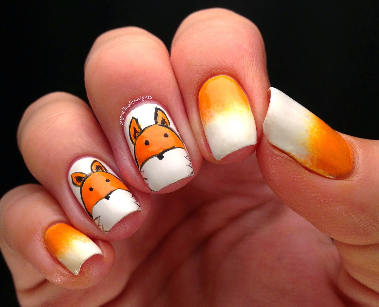 [EN] I painted these foxes earlier, but didn't publish then. Now they're right on time. I painted them only after having looked through dozens of pictures, as I wasn't sure about how foxes must look like. I hope these animals do look like foxes. What I'm really satisfied with about this mani are the ombre nails. I tried to bring the idea of foxes' fluffy tails into them and I think they turned out to be lovely.
